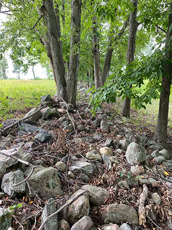 The stone walls in the center of these fields were in poor condition. The stones had collapsed and created areas that were impossible to manage effectively without annual chemical treatments. The stones were moved to another area on site so they can be used in the future to repair other stone walls on the property.
