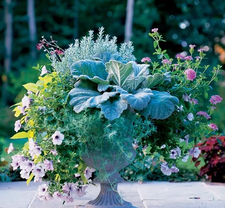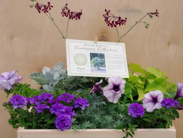 A collection of nine plants designed to create a professionally curated mix to plant in your own container. The mix includes Verbena, Ipomea, Lotus, Dusty Miller, Pelargonium, Salvia and Petunia.